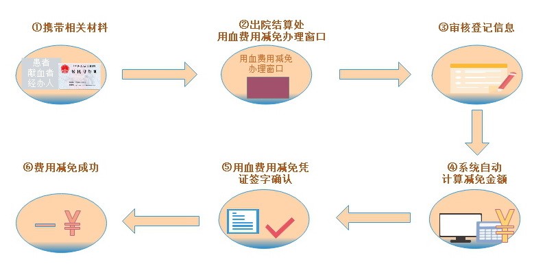 用血者携带相关材料,在出院结算办理窗口,进行用血减免申报。由医院工作人员审核登记信息,全区减免信息系统自动计算减免金额,然后由工作人员打印出用血减免凭证。用血者或代办人签字确认,完成用血减免工作。
